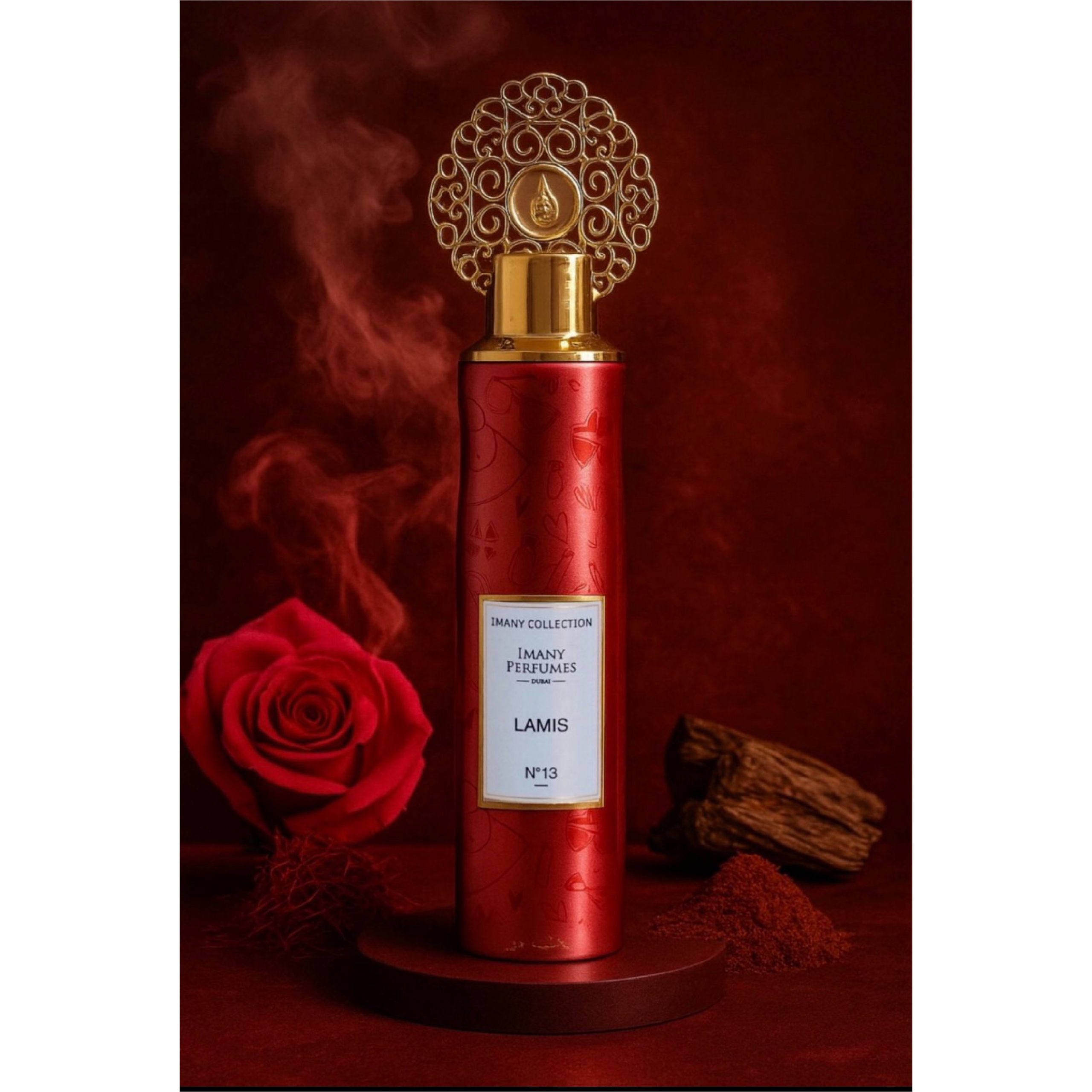 Le safran, noble et épicé, ouvre la composition avec intensité, avant de laisser place à une rose sensuelle aux accents mystérieux. Le bois d’agar et le patchouli dévoilent une profondeur boisée et précieuse, tandis que les résines et l’ambre enveloppent le tout d’une chaleur enivrante. Une fragrance puissante, luxueuse et magnétique.